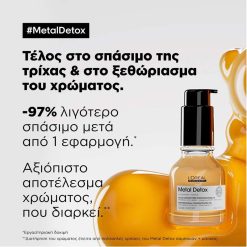 Το συμπυκνωμένο λάδι Metal Detox προστατεύει τα μαλλιά από την προσκόλληση μεταλλικών στοιχείων μετά τις υπηρεσίες βαφής, balayage και ξανοίγματος. Η συγκέντρωση των μεταλλικών στοιχείων στο εσωτερικό της τρίχας μπορεί να προκαλέσει σπάσιμο της τρίχας και να επηρεάσει αρνητικά το χρωματικό αποτέλεσμα στις υπηρεσίες βαφής, balayage και ξανοίγματος.
