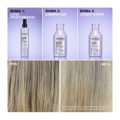 Σημαντικό: Το σύστημα Blondage High Bright θα πρέπει να χρησιμοποιείται μέχρι να επιτευχθεί η επιθυμητή φωτεινότητα. Μόλις επιτευχθεί η επιθυμητή φωτεινότητα, σταματήστε τη χρήση του σπρέι περιποίησης για πριν από το λούσιμο και είτε: 1. συνεχίστε να χρησιμοποιείτε μόνο σαμπουάν και conditioner ή 2. συνεχίστε με κάποια άλλη σειρά περιποίησης της Redken.